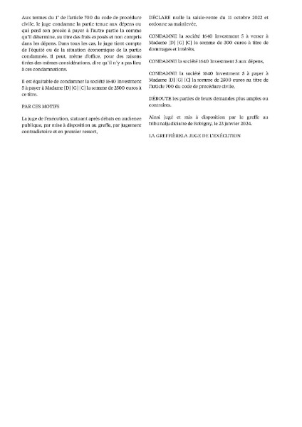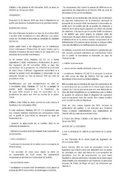 Dans une décision rendue le 23 janvier 2024, le Juge de l'exécution de Bobigny a annulé une saisie-vente pratiquée par la société 1640 Investment 5 au domicile d’une cliente, Mme [C], au motif que cette société ne justifiait pas avoir légalement acquis la créance à l’origine de la saisie.